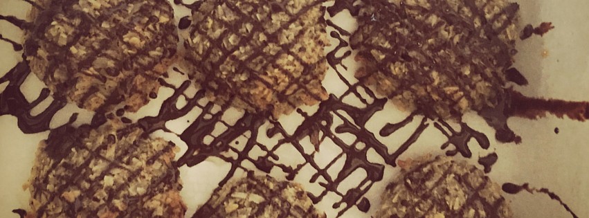 - Remove macaroons from the oven and allow to cool before drizzling with the cacao and coconut mixture to decorate.